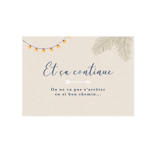 Au recto : Un message court du type « Et ça continue » ou « Que la fête continue ».