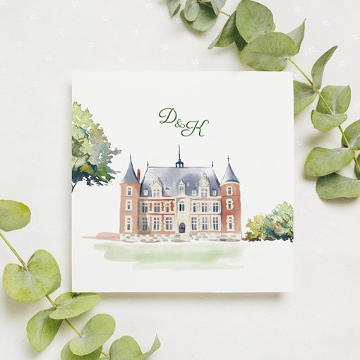 Faire-part dessin du lieu du mariage à l’aquarelle.