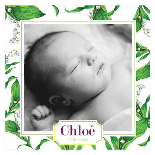 Recto : La photo de bébé est mise en valeur avec notre motif muguet à la fois doux et délicat. Le prénom de bébé sera inscrit dans la couleur de votre choix, ainsi que la date de naissance.