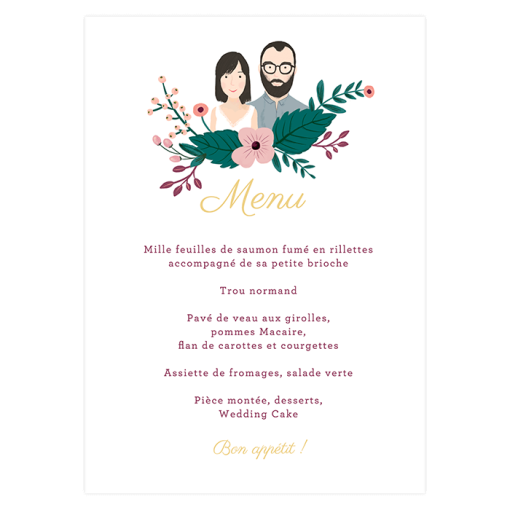 Un menu de mariage vraiment original puisqu’il sera illustré avec le dessin des mariés. Le portrait des mariés est réalisé d’après photo (de face).